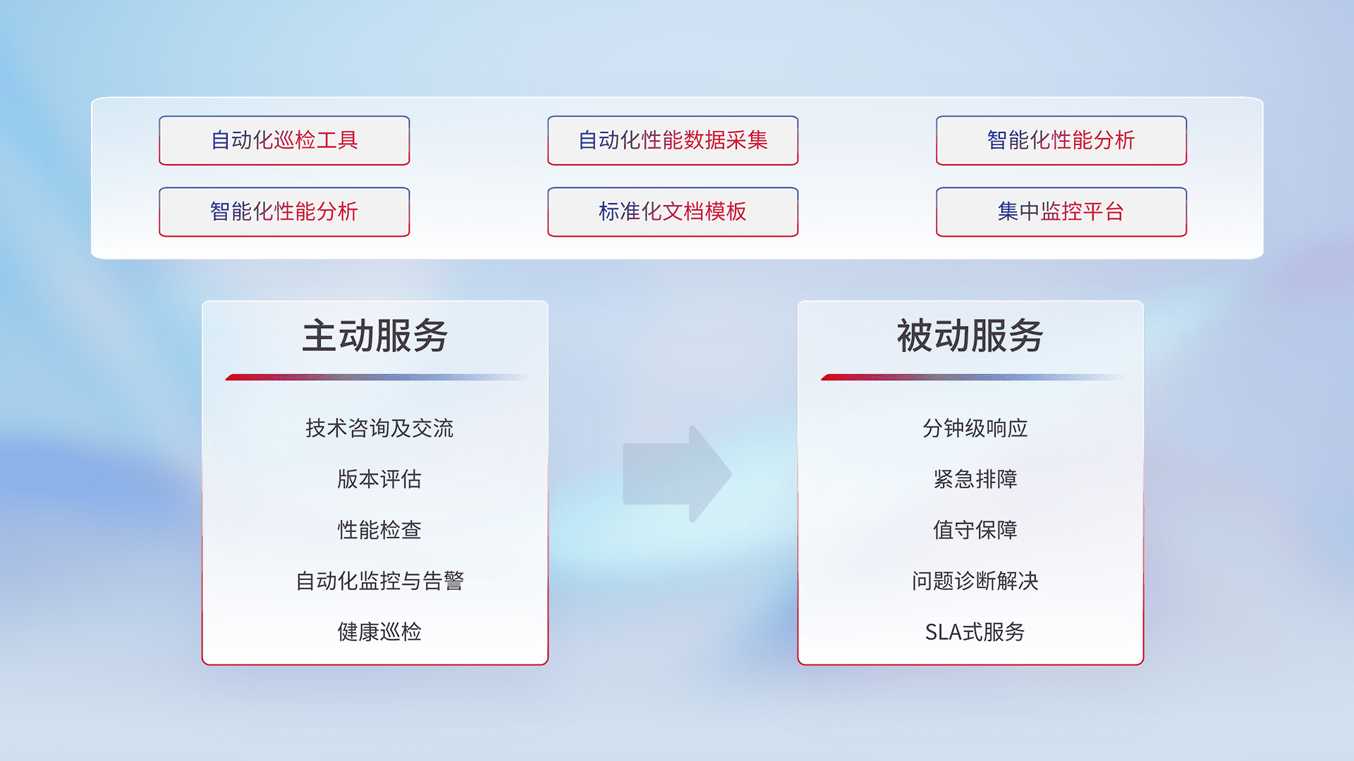 智能化工具和标准化文档,,,保障服务质量,,,,提供主动服务(包含技术咨询、、版本评估、、、、性能检查、、、、自动化监控与告警、、、健康巡检)和被动服务包含(分钟级响应、、紧急排障、、值守保障、、、问题诊断解决、、、、SLA服务)。。。